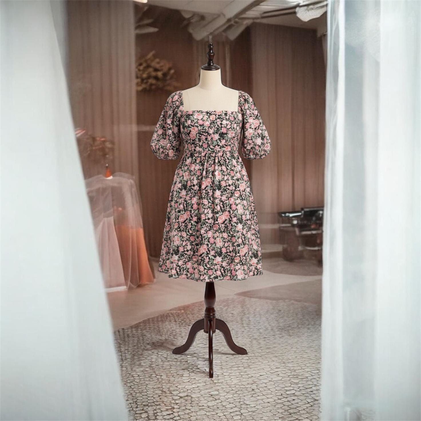 Pink Floral Puff Sleeve Dress